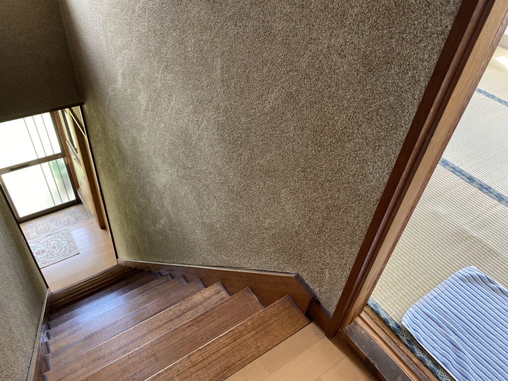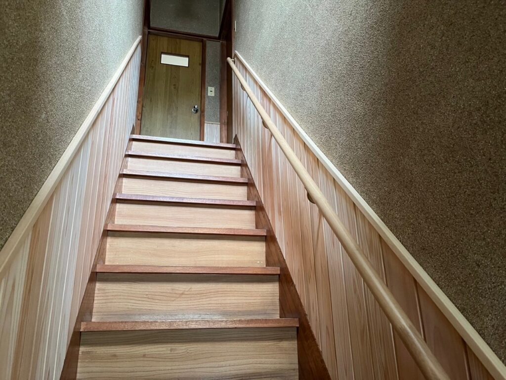 触るとポロポロと砂が落ちてしまう為、砂壁から羽目板を取付 急な階段にも手摺を取り付けました。