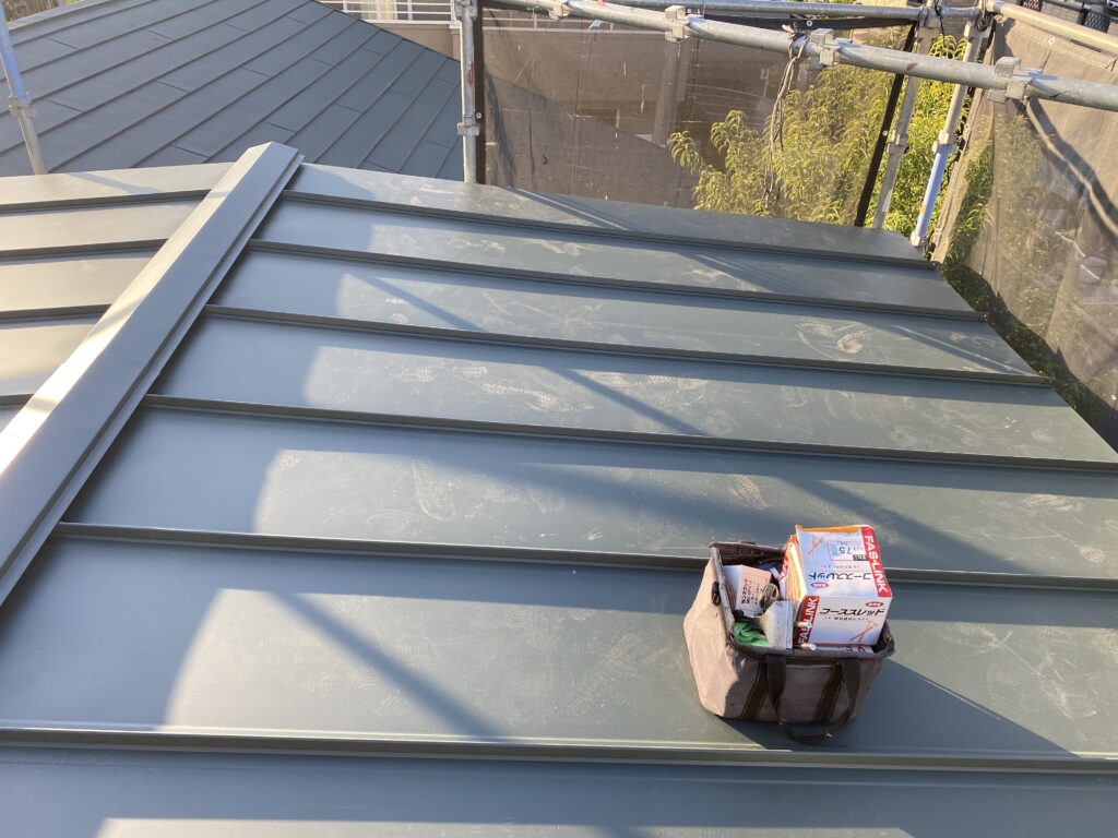 施工した材料がSGL鋼板(U352 つや消し)である程度のよごれは雨などで流れ落ちます。嵌合屋根材の為、雨漏りの心配がありません。メーカー長期保証(穴あき25年保証)※保証には別途条件があります。