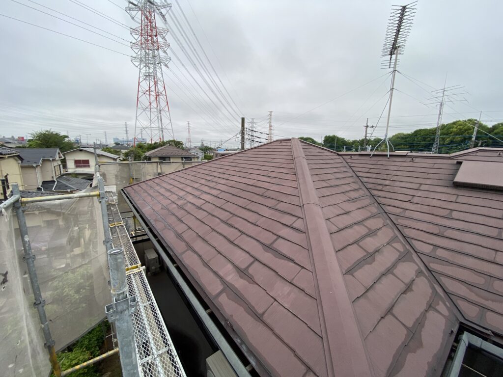 劣化によるスレート屋根の割れ、破損があり軽量の金属屋根材(スーパーガルテクト)で施工