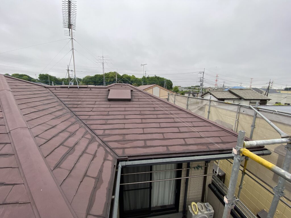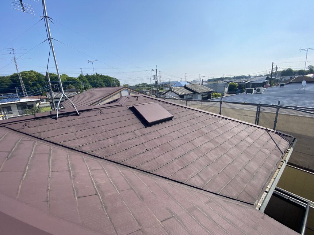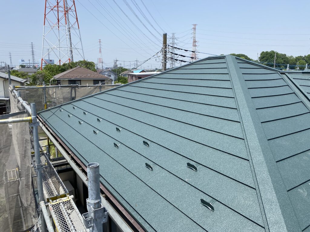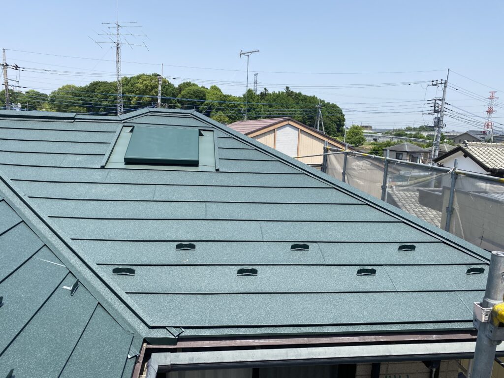 屋根材、近似色鋼板で換気部まわりも板金施工をし換気カバーは塗装仕上げとなりました。